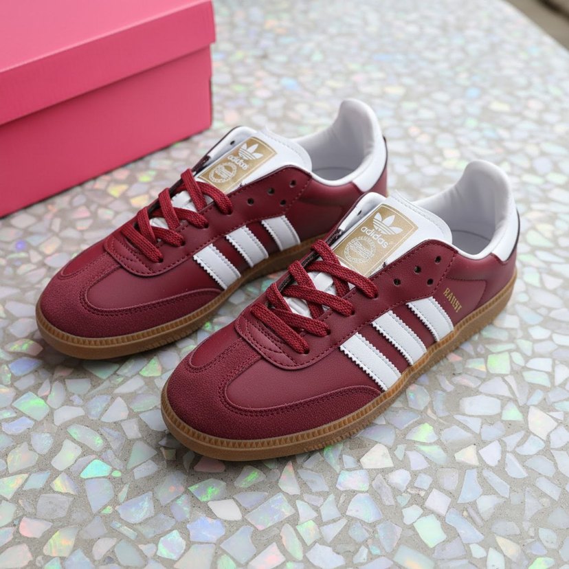 Beyaz şeritli ve gum tabanlı bordo Adidas kadın spor ayakkabısı, trend ve rahat bir sokak stili sunar. Spor ve günlük kullanım için uygundur.