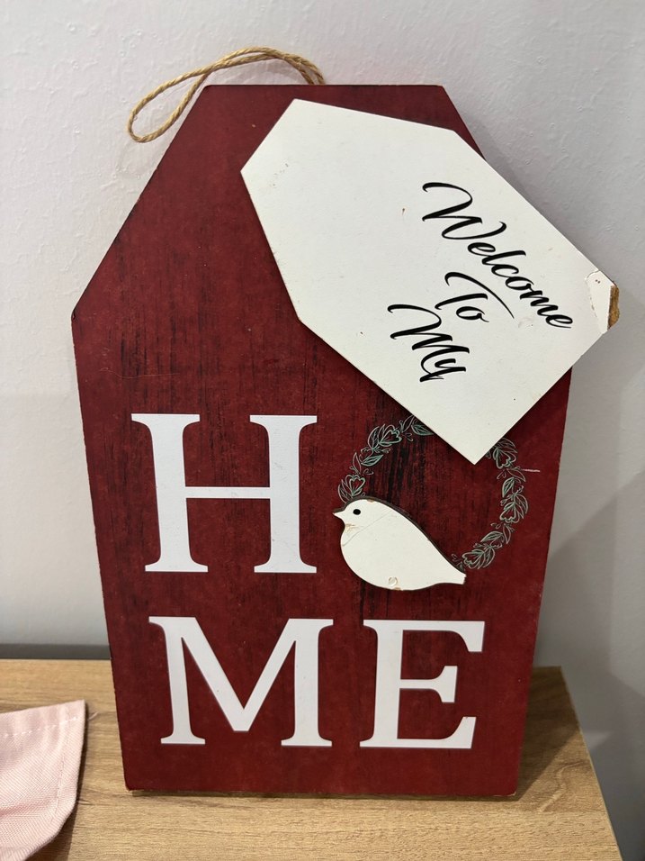 Bordo renkli, "Welcome to My" yazılı asma etikete sahip ahşap ev dekoru. "HOME" yazısı ve kuşlu çelenk detayı içerir.