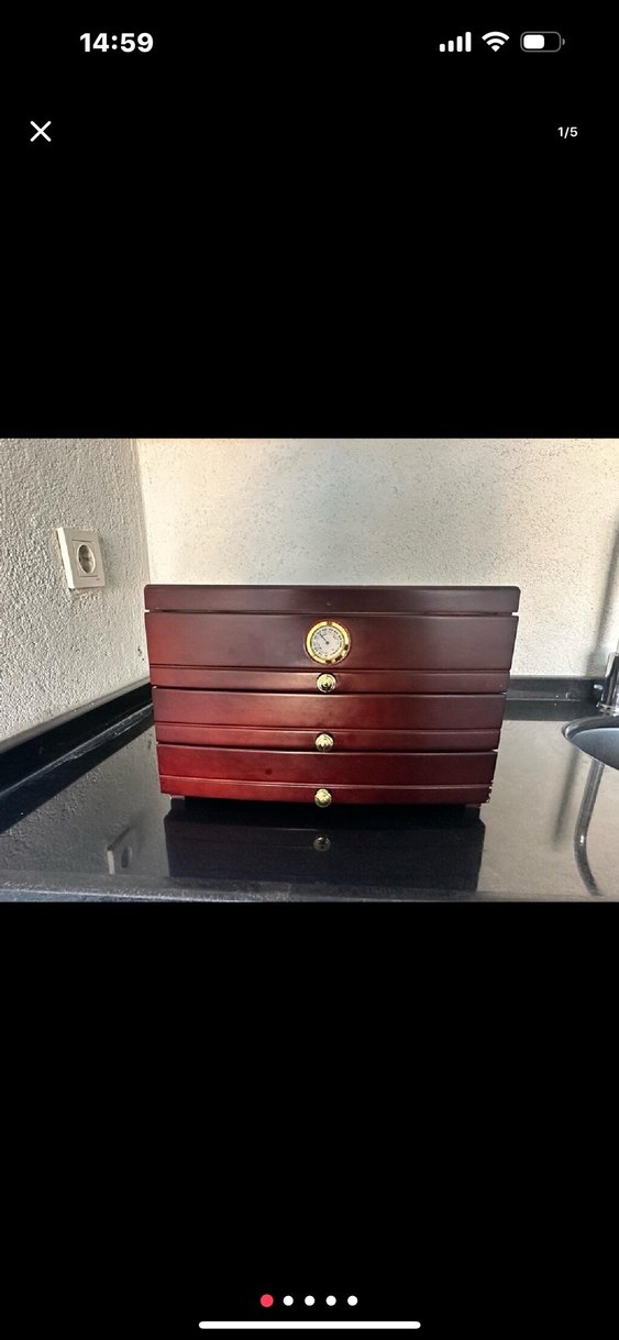 Bordo renkte, çok çekmeceli ahşap HUMİDOR tertemiz sorunsuz