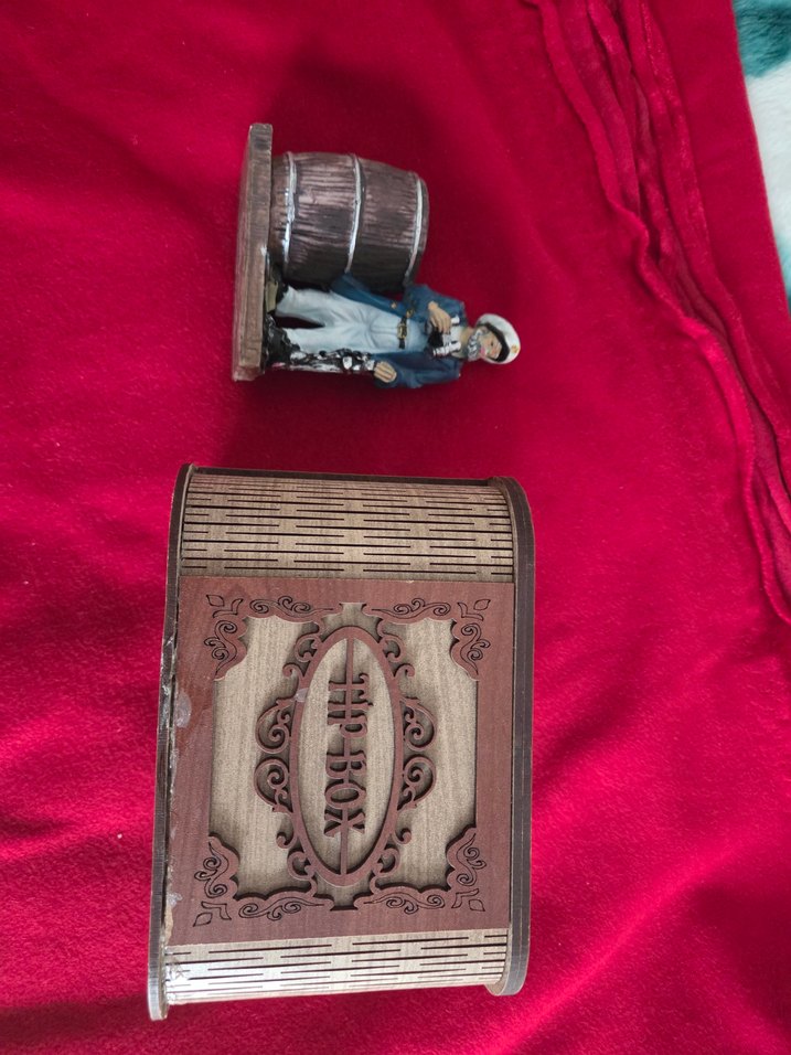 Koyu bordo renkli, detaylı oymalarla süslenmiş ahşap oyuncak kutusu ve yanında varil ile küçük bir figür bulunuyor.