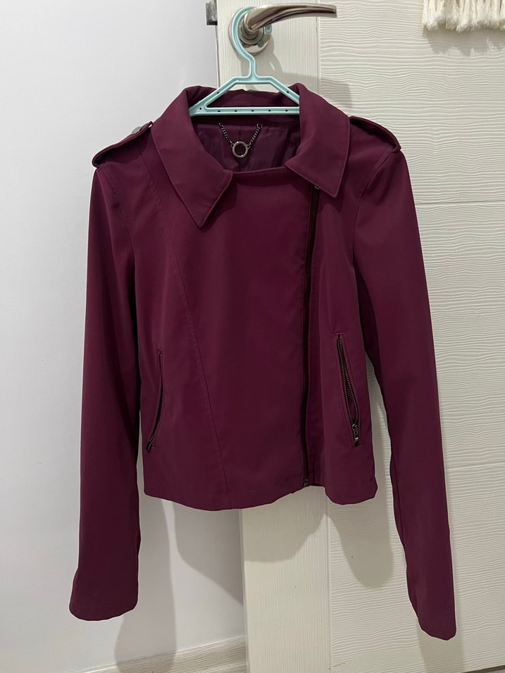 Şık bordo rengiyle kombinlere anında stil katan, modern kesimli ceket. Asimetrik fermuar detayı ve fermuarlı cepleriyle hem spor hem şık kullanıma uygundur. Kısa boyu sayesinde elbise, etek ve yüksek bel pantolonlarla çok güzel durur.