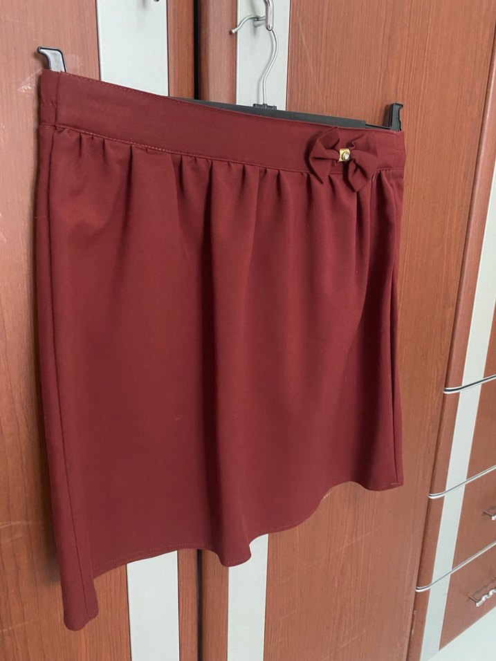Bordo midi etek, bol kesim ve drapeli tasarıma sahiptir. Parlak dokusu, asimetrik eteği ve küçük fiyonk detayı bulunur.