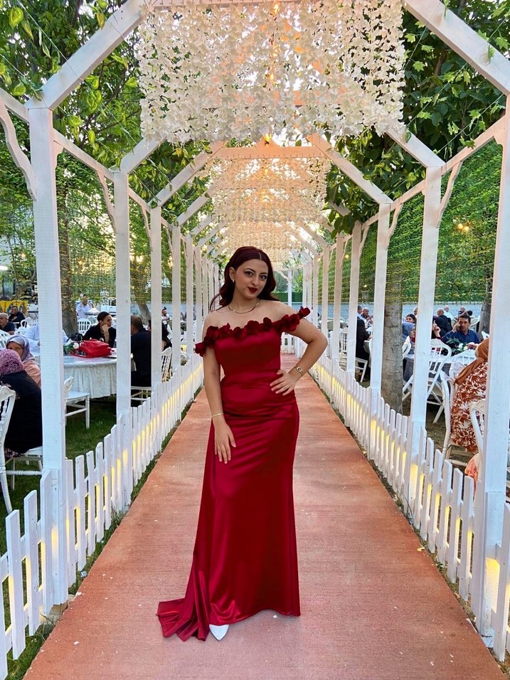 Parlak bordo renkli, askılı ve drapeli yakası güllü yandan yırtmaçlı ve yırtmacının üzerinde kuyruğu bulunmakta sadece bir defa giyildi pazarlık yapılır