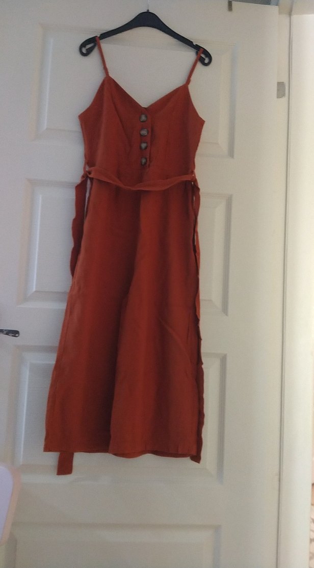 Bordo renkli uzun keten elbise, askılı ve straplez yaka detaylıdır. Belden kemerli, bol kesim bohem ve minimalist tarzda günlük kullanıma uygundur.