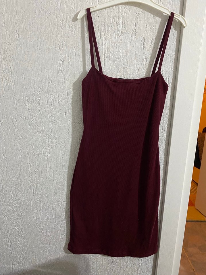Bordo renkli, askılı ve straplez yakalı, vücuda oturan midi boy elbise. Yumuşak sentetik kumaştan, günlük sokak stili için sade ve şık.