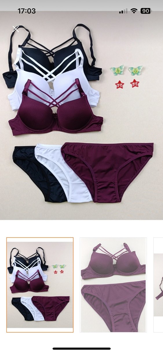 Üçüde sıfırdır sadece bordo ve siyah sütyen yıkandı diğer üç külot ve beyaz sütyen etiketli kalıp olarak dar geldiği için giymedim dolguludur üçüde alan pişman olmaz 75B bedeni