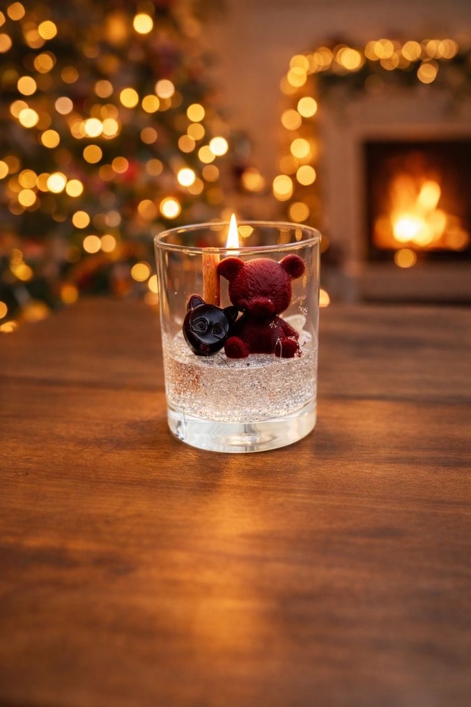 Bordo renkli ayıcık figürlü, renkli cam mumluk içinde mum. Sıcak bir atmosfer yaratır. ️