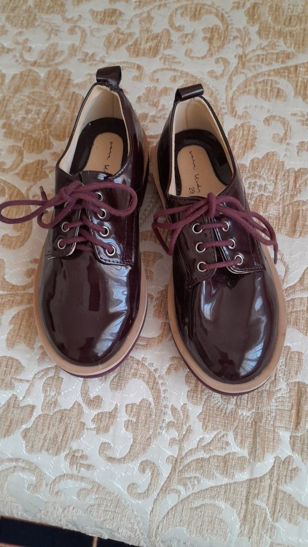 Bordo renkli, parlak görünümlü ve bağcıklı erkek çocuk özel ayakkabısı, kauçuk tabanlı ve klasik tarzda tasarlanmıştır.