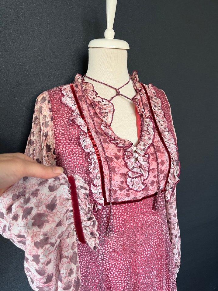 Bordo pastel tonlarda bağcıklı yakalı, fırfırlı uzun kollu, bol kesim bohem tarzı bluz.40 beden yazsa da 38 bedene de uyumludur ufak tefek lekeleri var yıkanınca çıkar