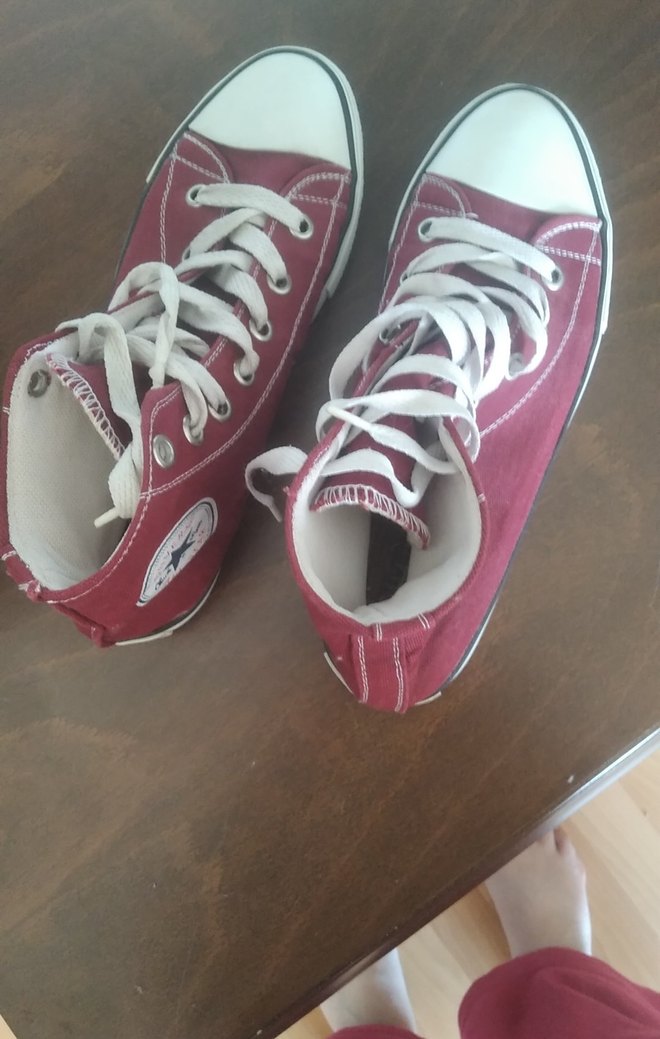 Beyaz bağcıklı, düz tabanlı bordo kadın spor ayakkabısı. Günlük kullanıma uygun, desen içermeyen rahat bir model.bazı yerlerinde leke var görselde çektim