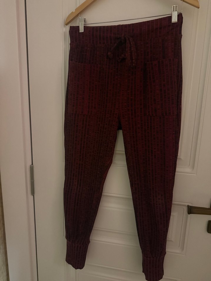 Bordo renkli, örgü kumaş ve batik desenli, bol kesim kadın pantolon. bağcıklı bel ve ribanalı paçalarla günlük sokak stiline uygun.karol marka herhangi sorunu yok