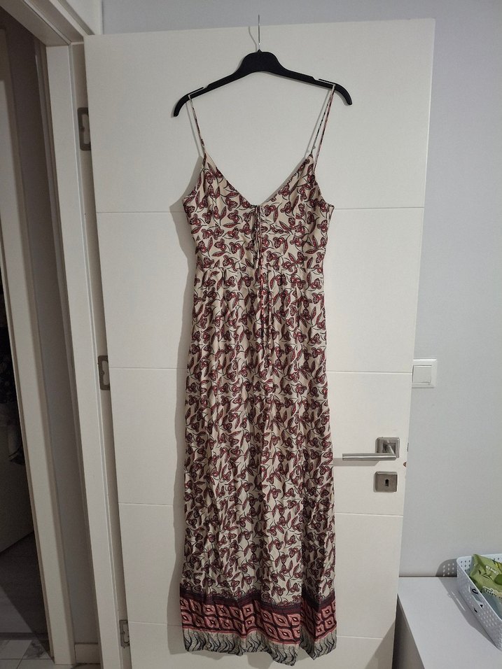 Bordo renkli, V yakalı ve ince askılı uzun elbise. Bol kesim, bağcıklı ve batik desenli, yumuşak sentetik kumaştan yapılmıştır. Günlük kullanım için uygundur.