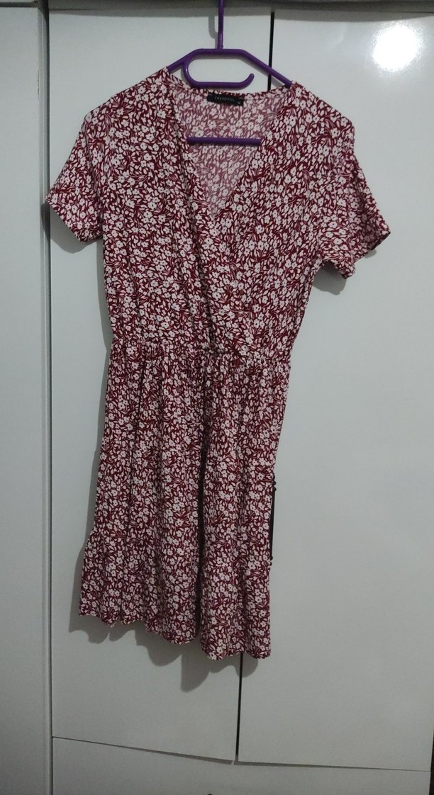 Bordo renk, kısa kollu, V yakalı ve düğmeli, bol kesim midi elbise. Bağcıklı ve batik desenli, bohem tarzda günlük kullanıma uygun.