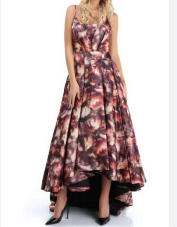 Bordo renkli, bağlama desenli uzun abiye elbise, V yakalı ve kolsuz. Salaş kesimi ve drapeli tasarımıyla düğünler için şık bir seçenek. Beden 42 olarak görunsede bel 40 gögüs 38 dar kesim bir elbise.