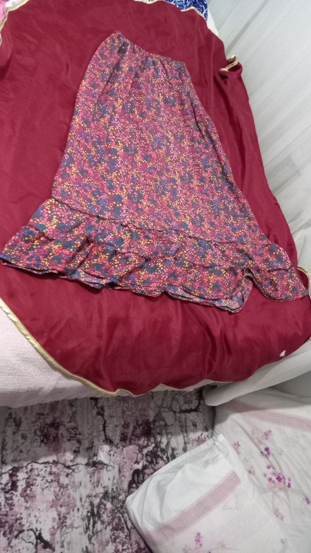 Bohem tarzda, bağlama desenli, bordo renkli, bol kesim hamile eteği, yumuşak sentetik kumaştan, volan detaylı, günlük kullanım için uygun.