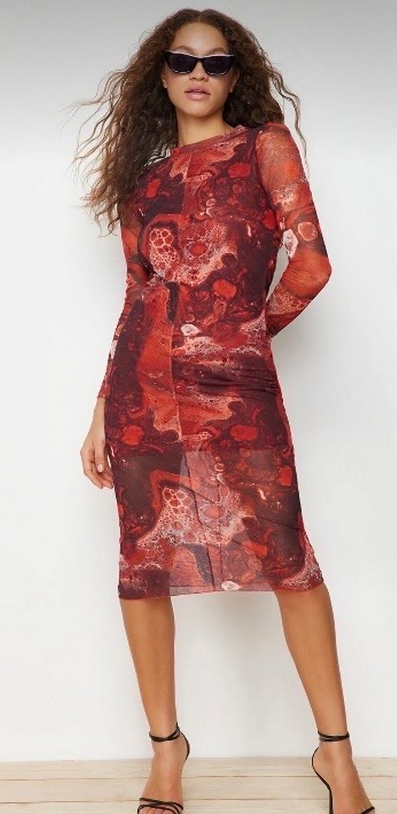 Bordo bağlama desenli, uzun kollu ve tekne yaka kesime sahip, sentetik kumaştan yapılmış, vücuda oturan uzun elbise. Romantik akşamlar için uygun, drapeli tasarım.