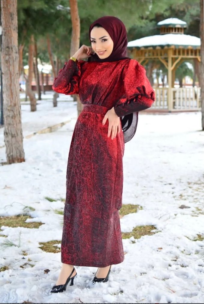 Bordo renkli, bağlama desenli, yüksek yakalı ve uzun kollu, bol kesim ve drapeli uzun tesettür elbise.