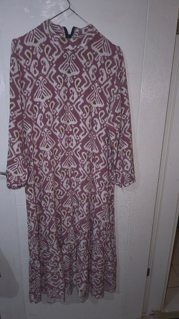 Bordo renkli, bol kesim, drapeli uzun elbise. V yaka ve uzun kollu, pastel tonlarda batik deseniyle bohem tarzını yansıtıyor. Sentetik kumaştan, günlük kullanıma uygun.