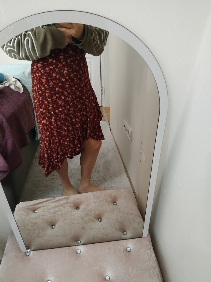Bordo renkli, bol kesim ve bağlamalı detaylı midi etek. Yumuşak sentetik kumaştan, günlük kullanıma uygun.