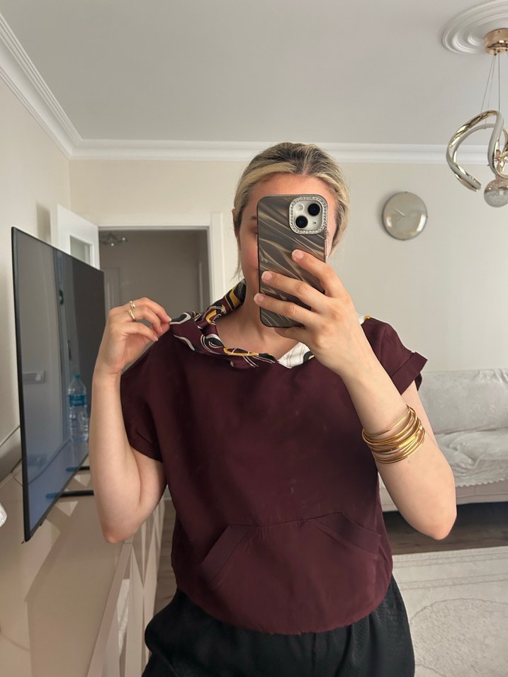 Bordo renkli, bağlamalı yakaya sahip, kısa kollu ve salaş kesim kadın bluz. İpeksi dokusuyla günlük sokak stiline şıklık katar.