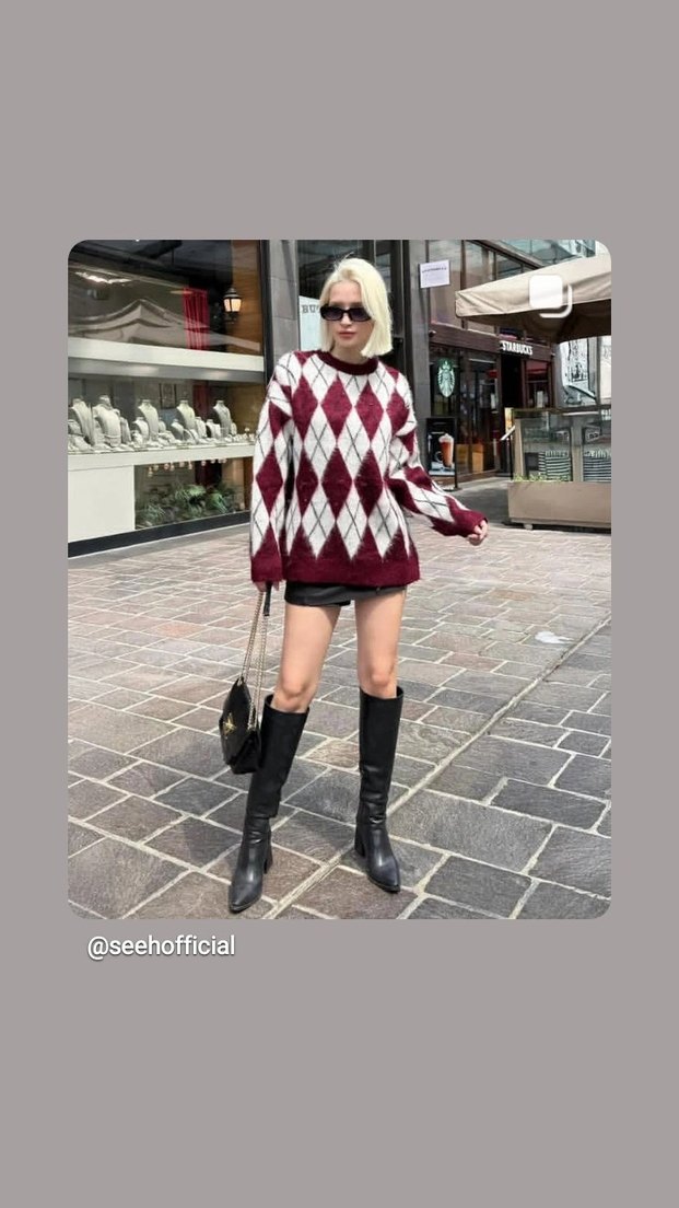 Bordo renkte, yüksek yakalı ve baklava desenli triko kazak. Salaş kesim, uzun kollu ve kısa boyu ile rahat bir sokak stili sunar. @seehofficial