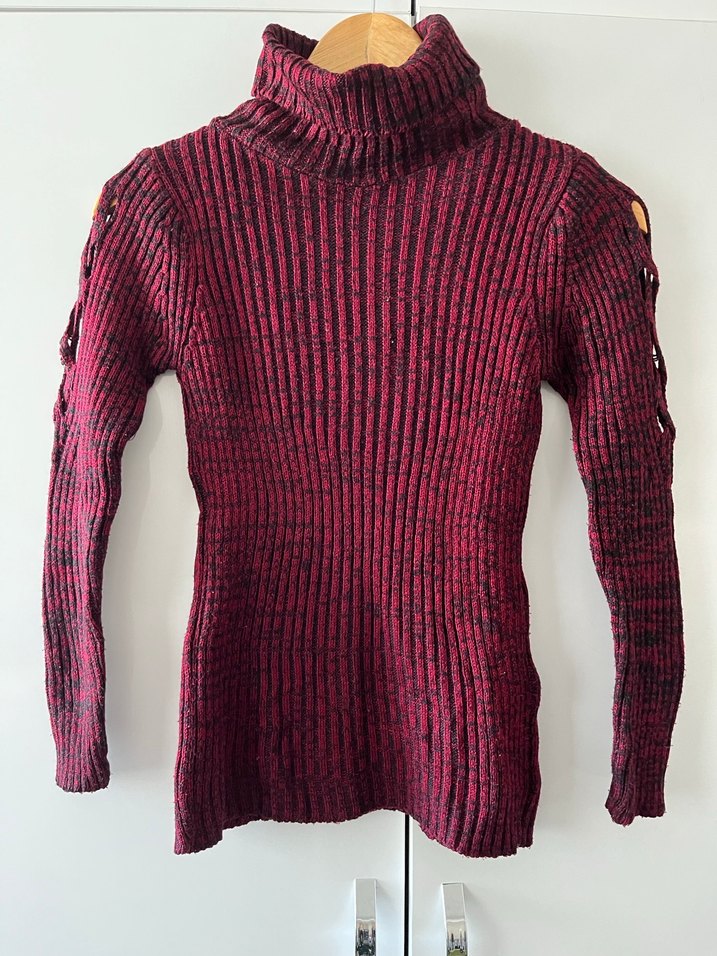Bordo renkli, balıkçı yaka ve uzun kollu, fit kesim triko kazak. Rahat ve gündelik tarz için uygun, midi boyda ve desensizdir.