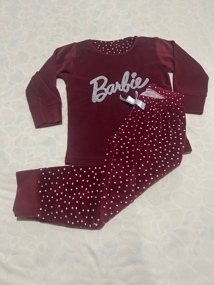 Bordo renkli kız gecelik takımı, uzun kollu ve bisiklet yaka üstü 'Barbie' baskılıdır. Yumuşak ve sıcak kumaştan, bol kesim puantiyeli pantolon ve düğmeli detaylar içerir. Yumuşacık kadife kumaştır