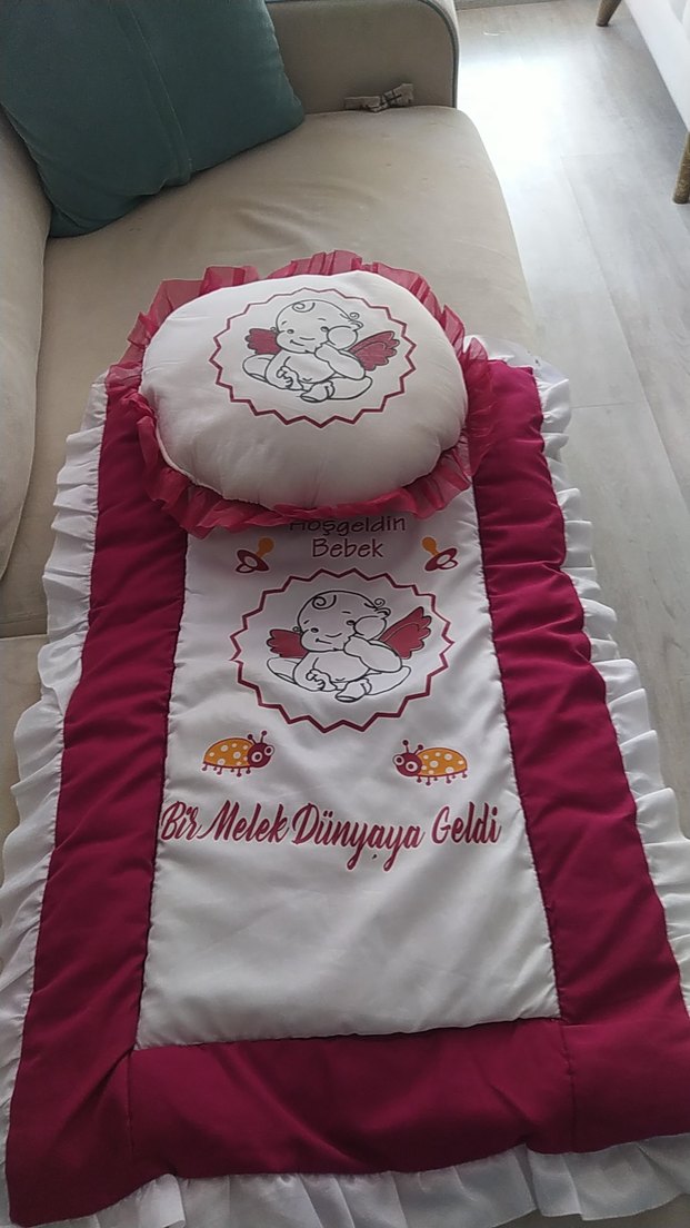 Bordo renkli, yumuşak ve sıcak kumaştan yapılmış bebek uyku seti. Melek ve uğur böceği desenleri ile "Bir Melek Dünyaya Geldi" yazısı bulunur. alt açma minderi yastığı