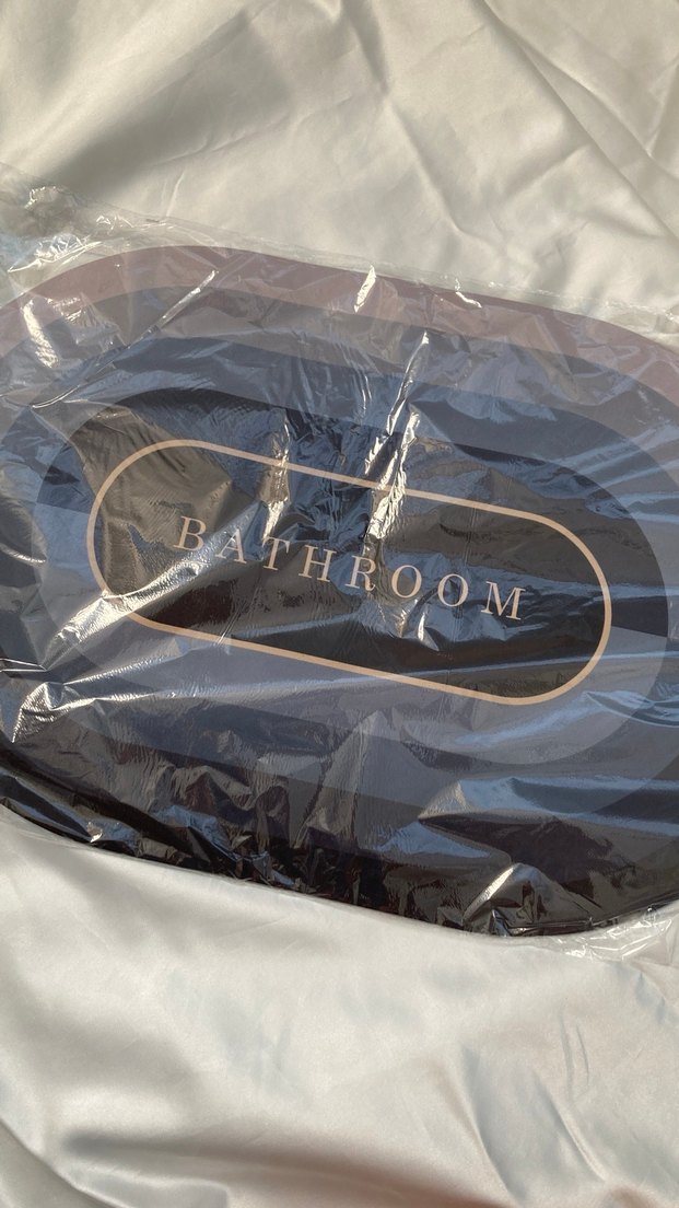 Bordo renkte, üzerine "BATHROOM" yazılı baskılı banyo paspası. Yumuşak dokusuyla banyo kullanımına uygundur.