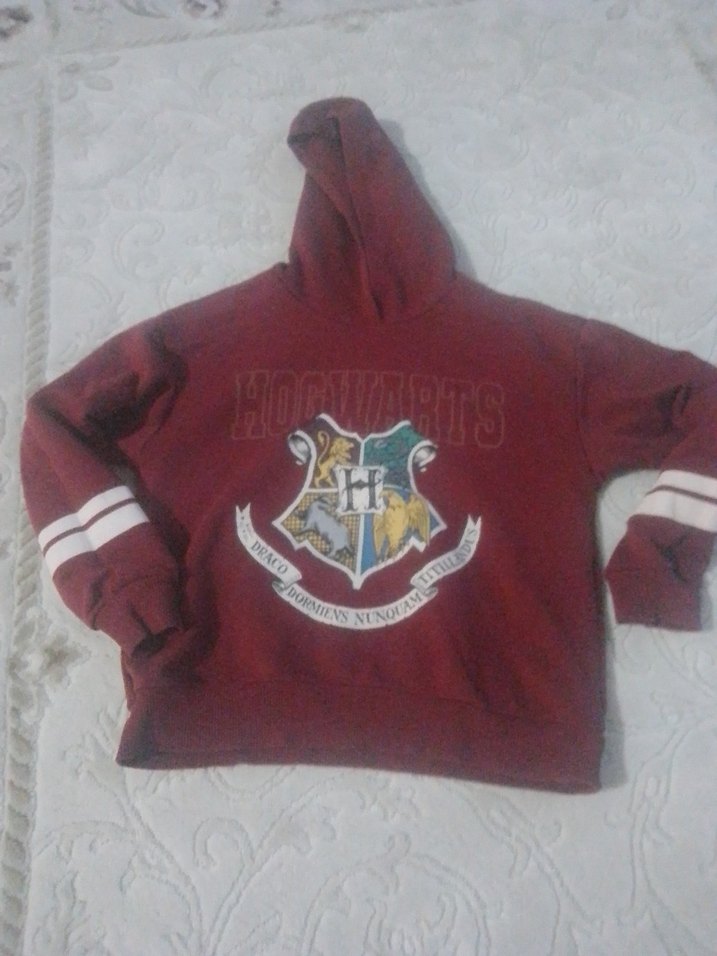 Bordo renkli, baskılı Hogwarts armalı, uzun kollu, düğmeli ve rahat kesimli erkek sweatshirtü.