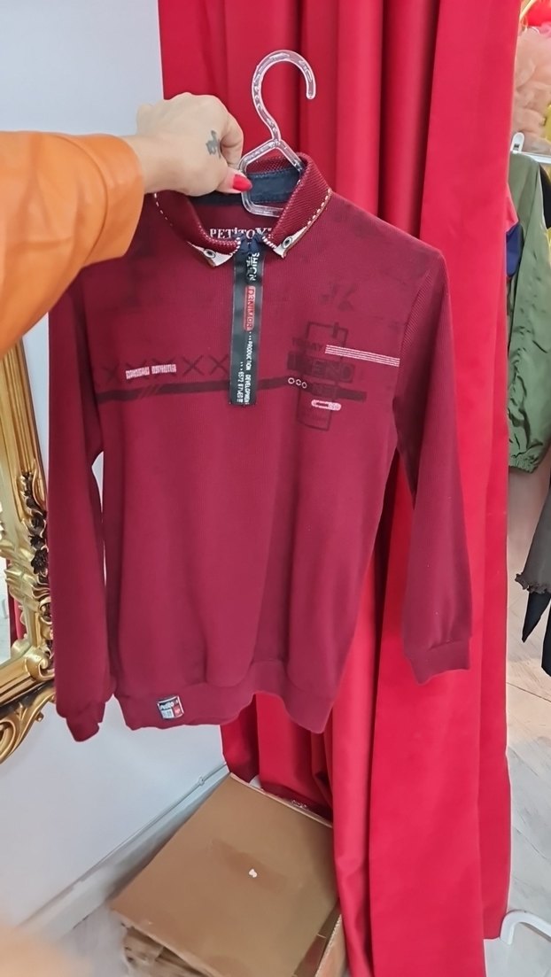 Bordo renkli, baskılı, fermuarlı ve yakalı erkek sweatshirtü, uzun kollu ve bol kesimdir. Sentetik kumaştan üretilmiştir.