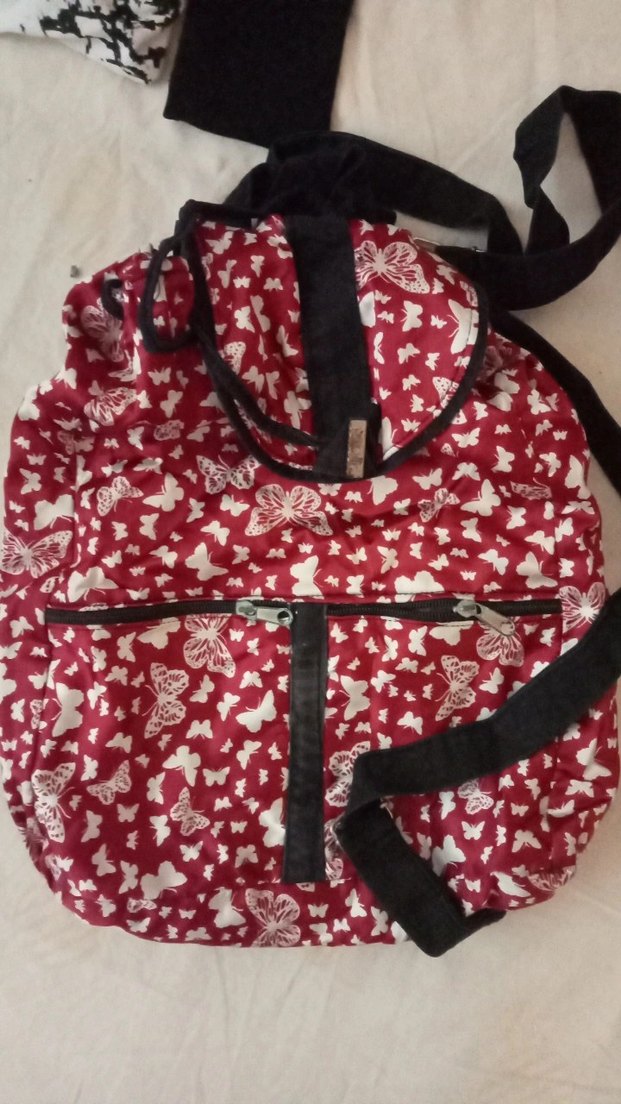 Bordo renkli, kelebek baskılı ve fermuarlı ön cebi olan sentetik kumaştan kadın sırt çantası. Bohem tarzına uygun, sokak modası için ideal.