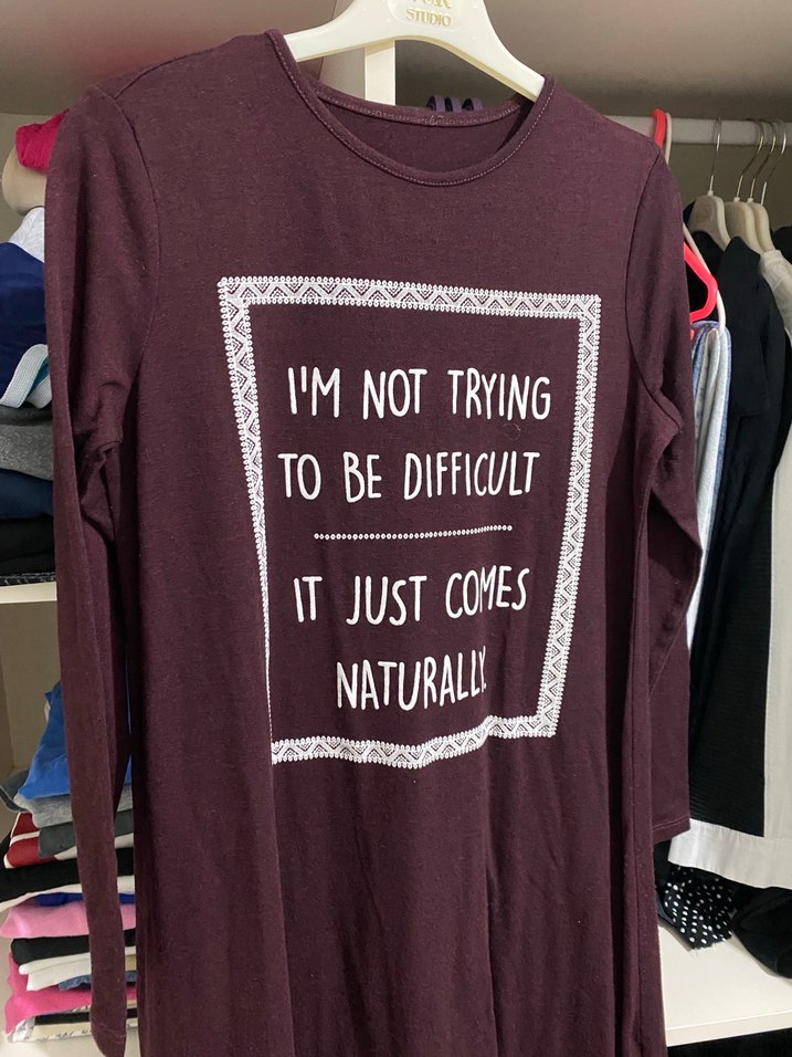 Bordo renkli, yumuşak pamuk kumaştan yapılmış, uzun kollu ve bol kesim hamile tişörtü. Önünde baskılı mesaj bulunur. Günlük rahat kullanım için uygundur.