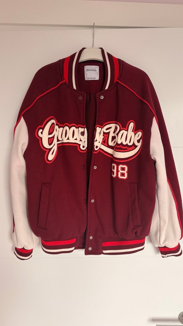 Bordo renkli, uzun kollu ve düğmeli ön kapamalı, baskılı detaylara sahip bol kesim bomber ceket. Sokak stili ve rahatlık sunar. en alttaki düğmesi kopuk