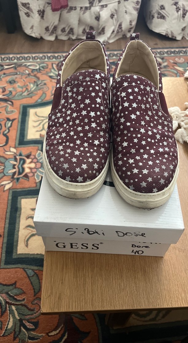 Bordo renkli, baskılı yıldız desenli kadın spor ayakkabısı. Parlak görünümlü, düz tabanlı ve tokalı tasarıma sahip. GESS markalı.