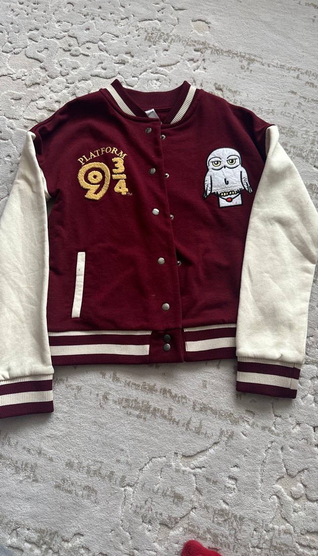 Harry Potter hayranları buraya :) Bordo ve krem renkli, düğmeli, baskılı, uzun kollu ve normal boyda kadın spor ceket. Crew neck yakaya sahip, fit kesim, rahat kullanıma uygun. Hediye geldi fakat bizimkiler Harry fanı olmadığından hiç giyilmedi.