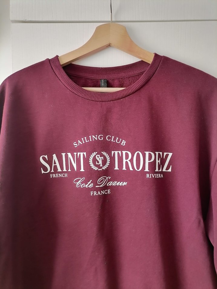 Bordo renkli, yuvarlak yakalı ve uzun kollu, bol kesim kadın sweatshirt. Yumuşak pamuktan üretilmiş, Saint Tropez baskılı günlük rahat stil için uygun.