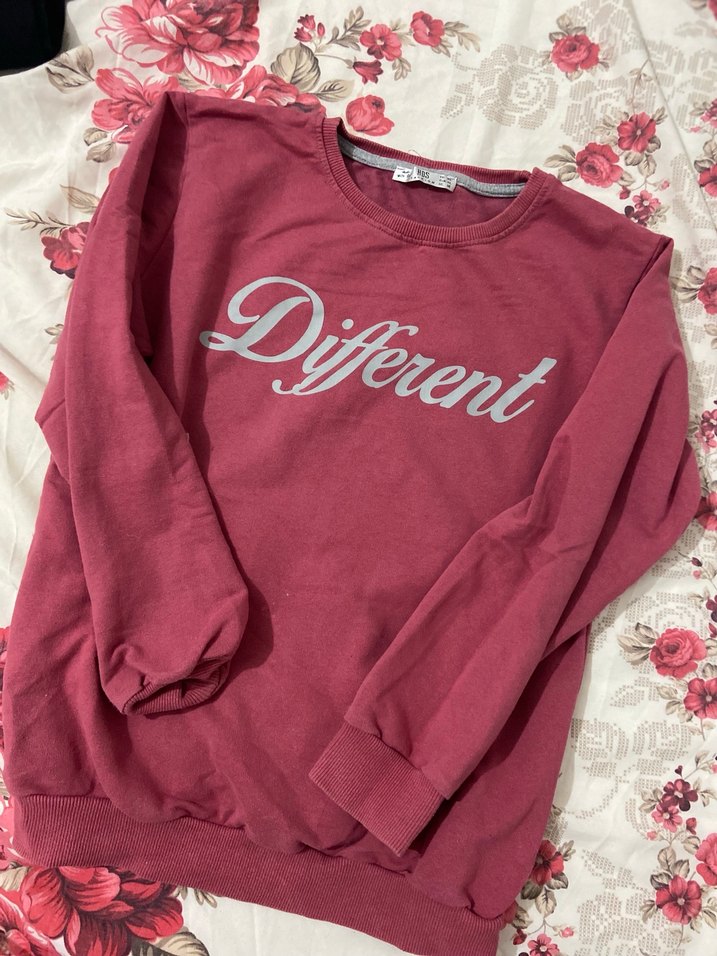 Bordo renk, uzun kollu, bol kesim kadın sweatshirt. Önünde "Diferent" baskısı bulunur. Günlük kullanıma uygun, rahat ve şık bir parça.