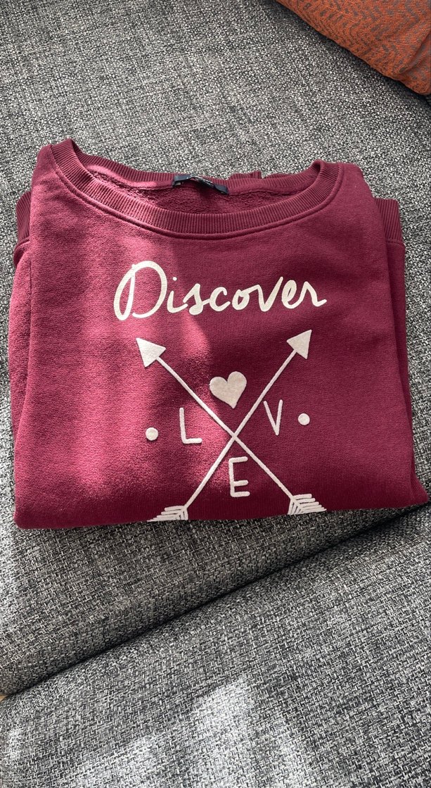 Bordo renkli, uzun kollu, baskılı ve bol kesim kadın sweatshirtü. Pamuklu kumaştan olup, 'Discover' yazısı ve fermuar detayı bulunur. Rahat sokak stili için uygundur.
