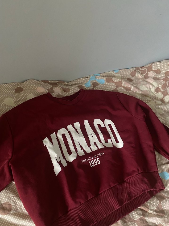 Bordo renkli, baskılı "MONACO" yazılı, yuvarlak yakalı ve uzun kollu, bol kesim kadın sweatshirt. Günlük kullanıma uygun sentetik kumaştan üretilmiştir.