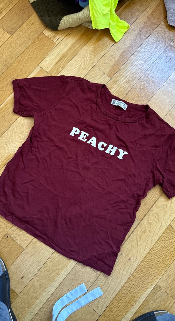 Bordo renk, kısa kollu, bol kesim kadın tişörtü. Önünde 'PEACHY' baskısı bulunur. İpeksi dokusuyla rahat ve şık bir günlük parça.