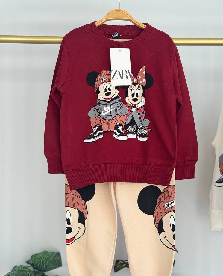 Bordo renkli, uzun kollu ve bisiklet yaka örme sweatshirt, Mickey ve Minnie baskılıdır. Bej renkli, Mickey baskılı rahat kesim eşofman altıyla tamamlanır. 2-10 yaş arası bedenler