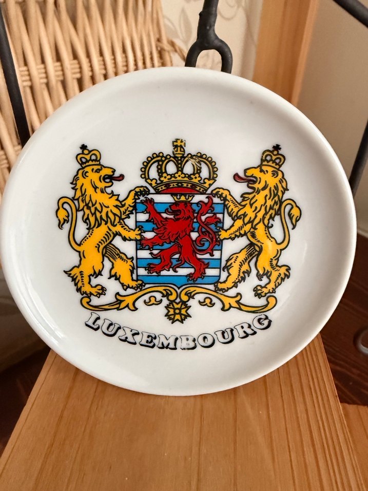 Bordo renkli, baskılı Lüksemburg armalı klasik tabak. İki altın aslan ve taç figürü yer alır. ️