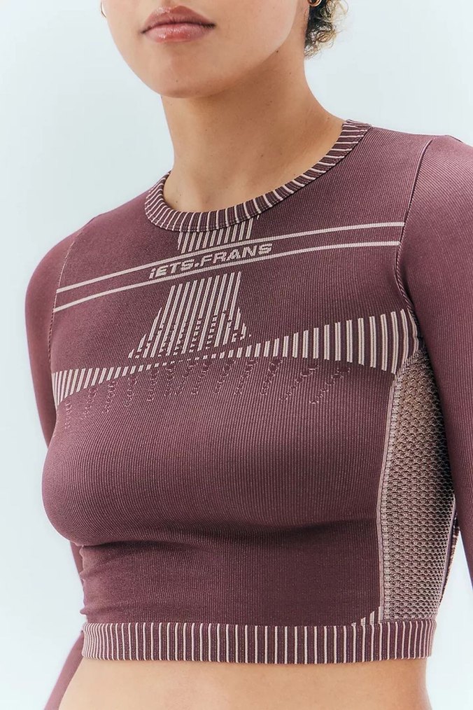 Bordo renkli, uzun kollu ve fit kesimli bu triko üst, örgü dokusu ve gri baskılı detaylar içerir. Bisiklet yaka ve normal midi boydadır, athleisure ve streetwear tarzını birleştirir.