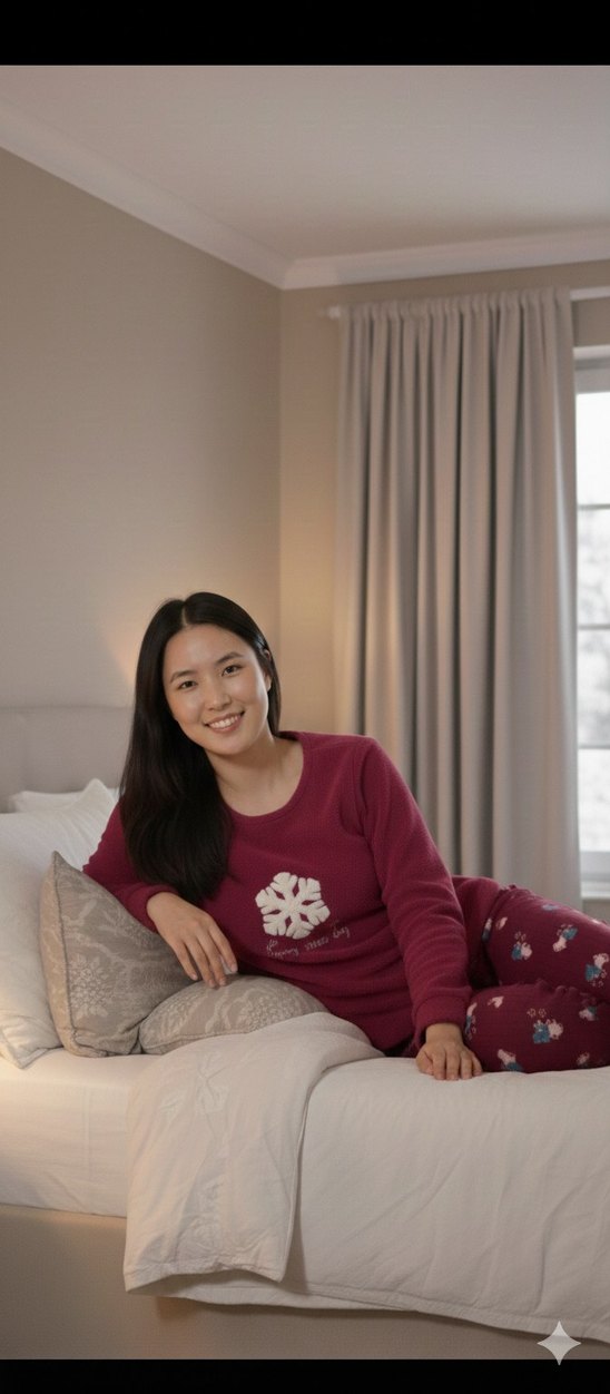 Bordo renkte, uzun kollu ve bol kesim kadın pijama takımıdır. Midi boyda ve baskılı desene sahiptir, rahat geceler için uygundur. ❄️