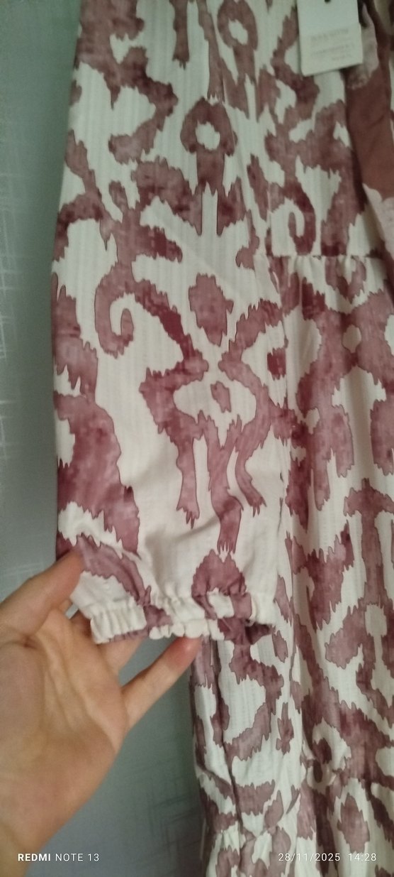 Bordo batik desenli hamile bluzu, drapeli V yaka ve kısa kolludur. Bol kesim ve midi boyda, yumuşak sentetik kumaştan günlük kullanım için uygundur.