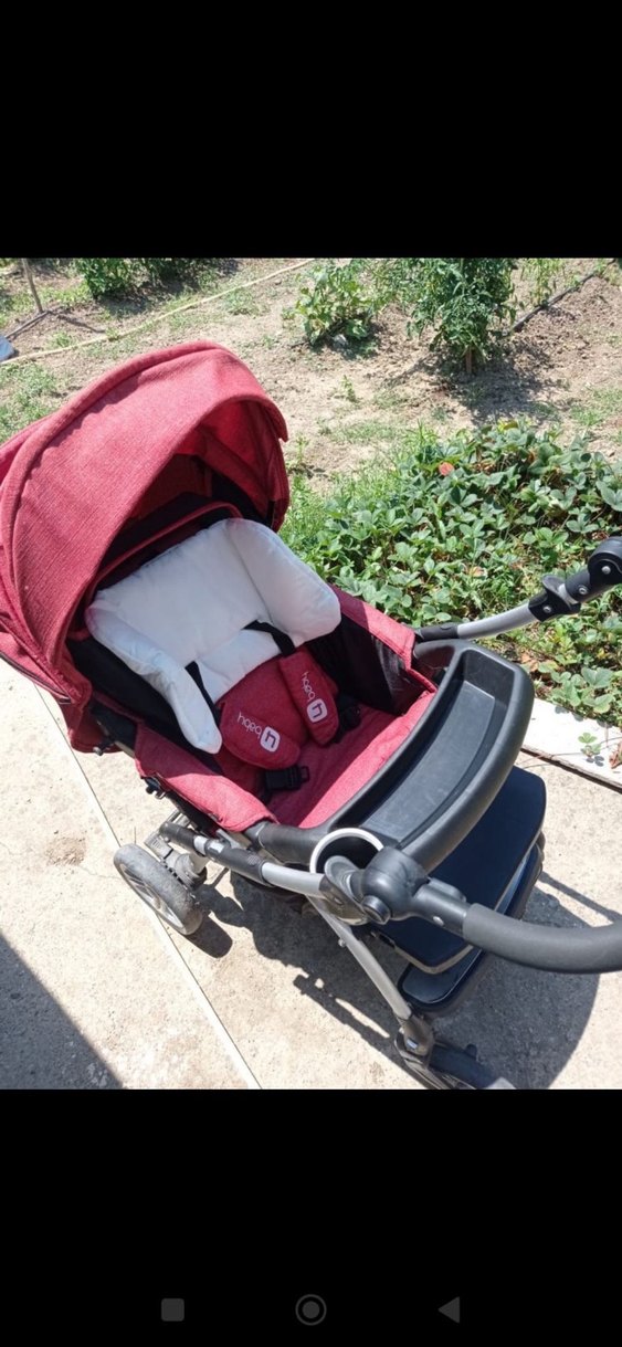 Bordo renkli, gri detaylı bebek arabası, konforlu oturma yeri ve ayarlanabilir tente ile donatılmıştır.