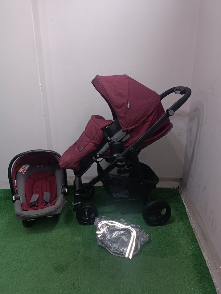 Bordo renkli bebek arabası, uyumlu taşıma koltuğu ve ekstra aksesuarlarla birlikte. Konforlu gezintiler için uygundur.