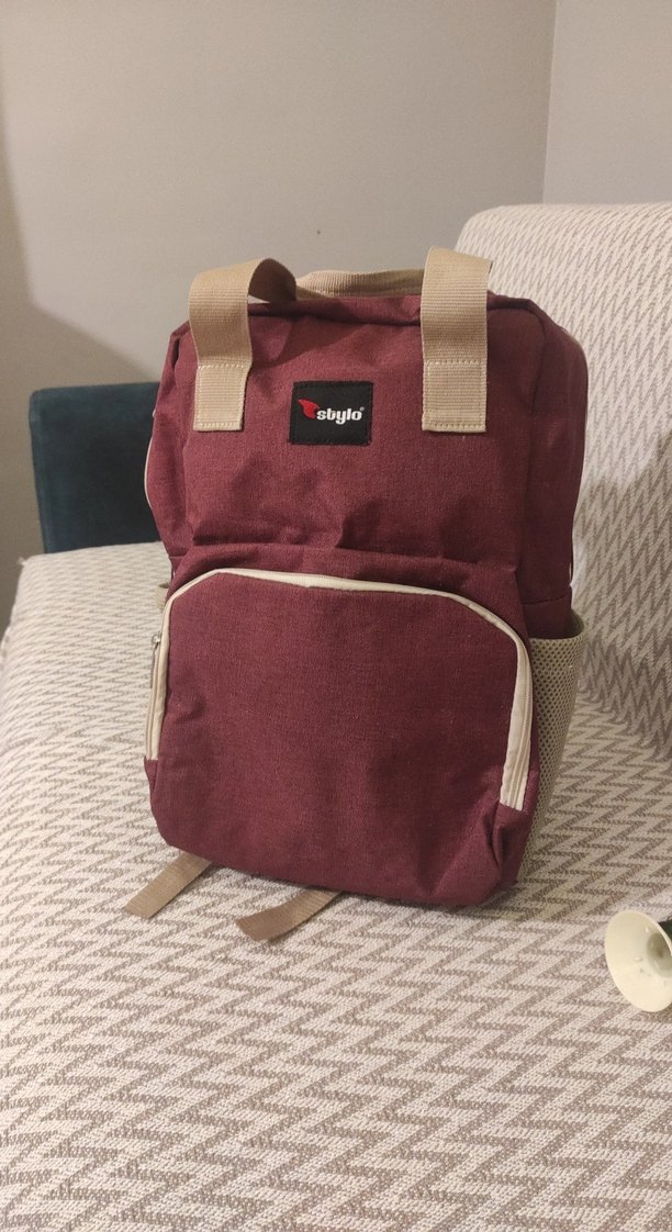 Bordo renginde, bej saplı ve ön cepli bebek çantası. Üzerinde 'sbylo' etiketi bulunur. Desensiz sade tasarım.
