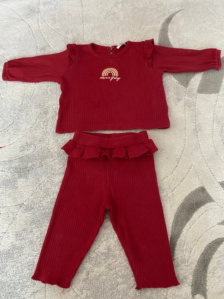 Bordo renkli bebek kız takımı, uzun kollu üst ve fırfırlı pantolondan oluşur. Üstte işlemeli detaylar ve yumuşak dokulu kumaş vardır. SORUNSUZ